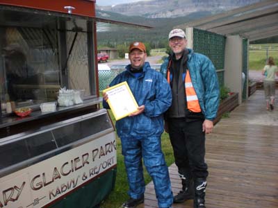 Having been to Glacier National Park on the Alaska ride, I looked forward to visiting again. We left Williston following Route 2 to Glacier. It was 450 HOT miles, with temperatures going above 100F a few times. Along the road everyone was making hay. It seems to me as if the local authorities allow ranchers to make hay along the side of the road. We also passed a rider on a horse, shotgun across the neck of the horse, with his dog. Sadly we did not stop to compare horses! We also passed through the Blackfeet Indian Reservation and saw hundreds of white crosses marking road-side fatalities. Almost on cue we came upon a crash that happened earlier in the morning. We arrived in St. Mary outside Glacier and tented in the KOA campground. Dinner was bbq ribs at a restaurant in St. Mary.