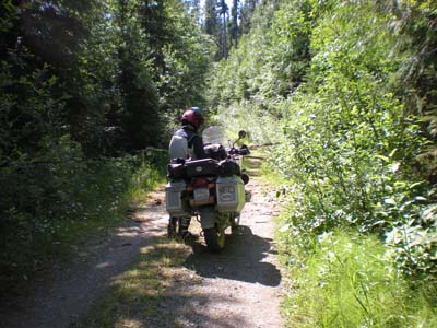Day 6 — Monday July 27, 2009 We got helped in good time by Big Sky Motorsports and around 11:30am we headed due north to Roosville and the Canadian border. Clear skies and the west side of Flathead Lake took us up RT93 to Roosville. We bought fresh produce for the evening and headed for the border crossing, parking our bikes between the USA and Canada. For a brief while I thought I led us into trouble. We passed the US Immigration Office and suddenly it hit me that both of us decided not to bring passports. To my relief it turned out that we can head back south as we took the CDT. We followed the coordinates we got of ADVRider.com and other sites. I felt for Barry, for we kept our rhythm of me leading us. Now being on gravel, Barry ate lots of dust. Reaching Red Meadow Lake early evening, we decided to camp. It is a pristine lake with grayling and lake trout. We could see the grayling jump. A few fly fishermen were around. Of course, we had plenty mosquitoes to deal with. I was more concerned about the bear warning we saw everywhere. We spoke with a guy who was camping on the back of his open truck. He came to scout for moose, having received a license after who know how many years of playing the hunting lottery. Dinner was pasta stroganoff, cantaloupe, beer, and a little bit of Scotch! It was truly an amazing campsite.