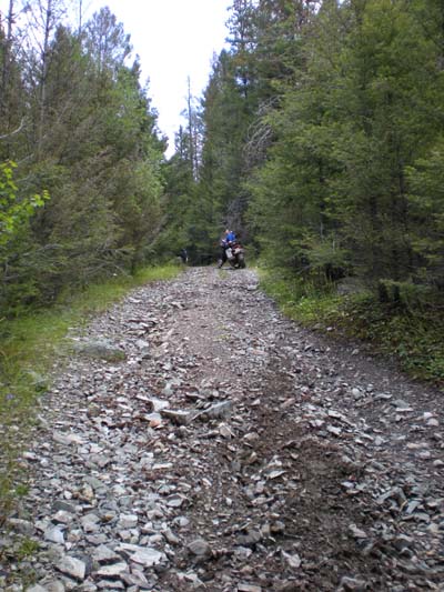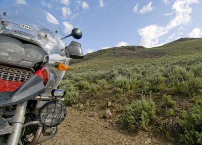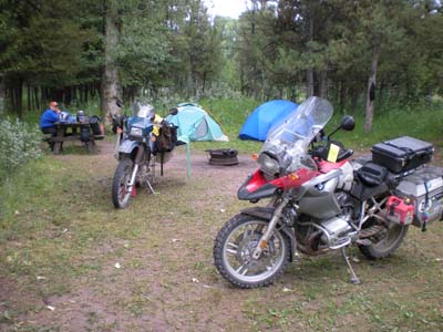 Day 8 — Wednesday July 29, 2009 Leaving Ovando on a cold 40F morning, we were heading back into the Rockies as we came upon a heard of horses in a beautiful field. It reminded me of Marlboro country. Barry appreciated the rain that fell, since that took care of the dust. We soon hit an obstacle when the trail was closed for motorized transport. Good citizens we are, we turned around to seek a way back to the CDT. Back on the CDT, but we were still not sure, we came to a section that was very wet. We continued as the trail turned uphill. Up on the pegs I enjoyed the throttle and ran up the hill. The terrain got steeper with deep ruts and large rocks. There was no gravel to speak of and soon I recognized that if I stop, I'm going to fall. A few times I ventures close to the drop off on my left as that was the best line, but recognizing that if I go down there I'll never get the bike up to the trail, I ventured back towards the middle. It was then that I convinced myself that stopping is the wisest option. I could see how I shred the tires to pieces with the sharp rocks underneath. As I reached near zero speed, I sat my foot down which promptly slipped on the rocks. Down I went. In the adrenaline rush I tried to pick my bike back up, but no luck doing that against the slope of the hill. I turned around and shouted at Barry, who was nowhere to be seen. The reason: he too laid down his bike on what we now refer to as "Disaster Hill." Unlike me, Barry could pick up his bike. After some discernment we concluded that going up is not a good choice. Now we have to go downhill on a nasty slope. With MUCH effort I turned the bike around and headed downhill, jumping ruts and dodging rocks bigger than footballs. At the bottom of he hill just before the wet section, I look up and about 30 yards ahead of me is a biggish grizzly cub, seeking food in a cabin's garbage bin. Not knowing what to do, since the trail passed within a few yards of the bear, I honked, and the bear ran off. Barry soon joined me and honked too, thinking that I am celebrating getting off Disaster Hill. Only then did I tell him of the bear. Trying to find our way around Disaster Hill we stopped for a snack, not finding ourselves on our GPS's or on our maps. It was then that we were joined by a guy on a 250cc Kawasaki KLR. Brad, from Fargo. He was also lost, but came from a totally different direction we came from. He joined us for a while as we sought the trail. We jointly decided to hit the pavement to make some time, and we parted with him. We camped on the Wise River in a US Forest; the 4th of July Campground. Beautiful! Having had rain every day on the trail, we could dry out our tents. Marlboro horses