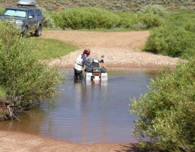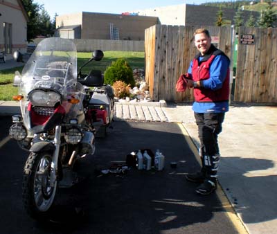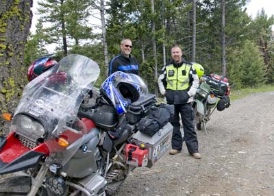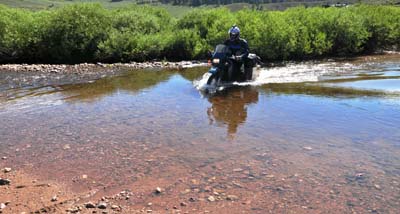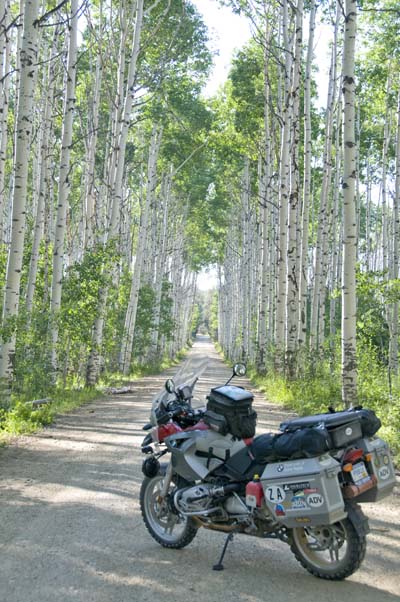 John walking his way along the CDT. Day 12 — Sunday August 2, 2009 We had an exciting day passing through awesome terrain. We headed south east from Rawlins, a mere truck stop on RT80, and headed through Medicine Bow National Forest to Colorado. It was great ride, with elk, dear, and cows along the way and passing through the famous Aspen Alley. I never would have guest that this would be a very exciting day, with me discovering an impulsive streak I never new I had. After about 5 hours of gravel we came to Steamboat Springs, CO, as lunchtime reminded us that we needed a good meal. A great salad at the Cantina on Main Street brought many curious looks at our bikes and a few phone calls home. We followed a narrow path along the Yampa river leaving Steamboat, heading to Kremmling. First we were greeted by a runaway bull. I had visions of it chasing my red bike, but we passed it without incident. At times the trail was so narrow what I wondered how 4X4s can manage the road. The trail told us to go over the dam wall of a reservoir, but it was not open to motorized traffic. We found a way around and headed towards Kremmling. A dirt trail took us to a trout stream that was flowing healthily. There were 4X4s this side of the stream and 4X4s that side. Nobody tried to cross. With me leading, I looked at the stream and thought my bike can make it. Mistake #1. Instead of walking, I plowed right into the stream, even as Barry said that maybe we should turn around. I made it about three quarters through the stream when my bike died. Immediately I knew that there must be water in the oil/engine. After the obligatory photo, Barry waded in and we pushed out the bike. I cranked the engine as we got to the other side of the stream and the bike started right up. I though, man, BMW make sturdy bikes. I road the bike out of the stream and only now did we walk the stream. A mere 3 yards downstream from my line, Barry crossed without a problem. We got back on our bikes and as we pulled off, every warning light on my bike flared up. I knew immediately: water in my oil/crankcase. Only, we were in the middle of nowhere on a Sunday afternoon with no oil between us to do an oil change. I stopped, telling Barry the bad news. It so happened that I stopped at a ranch gate. Always an optimist, I said to Barry that ranchers must have oil, and walked to the homestead. Enter Maurice. When he opened the door, he said he knew that happened to me... To make a long story short, Maurice was a Samaritan. Not only did he gave me oil, he helped me change the oil and then took the muddy, foamy oil I gave him. Without him I would have been in deep trouble. That I forgot the BMW's oil drain plug is a story for another day... With fresh oil, we made it to Silverthorne, CO. It was an eventful day! But more adventure is upon us!!