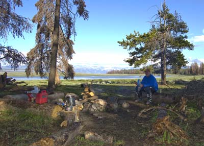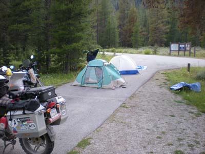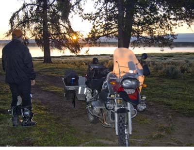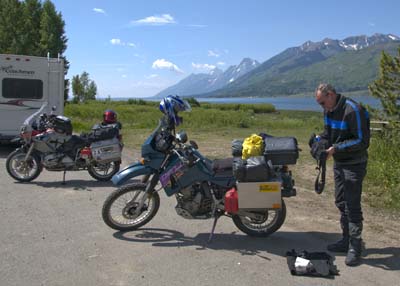 It must be the 2920 miles since we left Holland that made me do it, but I set the alarm for 5am and not 6am as planned. None of us looked at our watches and as we packed our bikes, we discovered it is pretty dark out there. Being a good Calvinist, I felt guilty and offered Barry breakfast, with McDonalds the only restaurant open at 5:30am. It was a Godsend, since we entered Yellowstone well ahead of the regular tourists. We saw elk, bison, and of course many geysers and Old Faithful. We arrived just in time to see Old Faithful perform and I took way too many pictures of the geyser. What a place! By now the crowds have come out and we fought them and construction as we headed to the Tetons. Stopping to take pictures, Barry discovered that his water bottle emptied in his Pelican case, his dust proof and waterproof pannier! No harm done, he dried his electronics and off we went. On the next photo op a woman came to us, asked us whether we are on the CDT, and continued to tell us of a guy who crashed out horribly on the trail. Then she walked off. That evening I shared with Barry that I wondered what would happen if I walk up to a woman, ask her if she has breasts, then tell her of someone I knew who died of breast cancer and then walk off. It was good that I listened to Robert Pirsig's "Zen and the Art of Motorcycle Maintenance" on the ride out to Roosville. People do engage motorcyclists in strange ways... Having enjoyed Yellowstone and the Tetons, we headed up Union Pass and camped near Mosquito Lake amongst thousands of cow paddies. Less mosquitoes than expected. Our meals always go down well with a snack before, a not-so-cold beer, and an instant dinner. We had a cold night in the upper twenties.