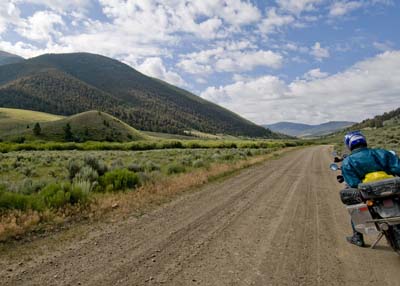 Day 13 — Monday August 3, 2009 Wanting to make sure that the engine was free of water, I performed another oil change in the parking lot of the Silver Inn in Silverthorne. This time I remembered the drain plug and in no time I was ready to head into Breckenridge. Not skiers or wealthy, we made no attempt at stopping in Breckenridge and headed for Boreas Pass. The gravel road was right in line for the dual sports and we has beautiful vistas. The road to Hartsell was beautiful, with someone's development that never came through. Roads everywhere, even a playground with a baseball diamond, but no home or people. In Hartsell we sat out a thunder storm and continued south. Passing through the San Isabel National Forest, I passed Nick from New Zealand, riding the CDT solo. We talked rugby and cricket, and then I moved on. We came to a stream and I stopped. Once burnt, twice shy, they say. As Barry caught up with me, Nick, peddling his way and pulling a bicycle trailer, mozied right through the stream. It was a few inches deep! A great lunch and walk through in Salida told me we are getting close to Mexico. We continued on to the fertile Rio Grande Valley and camped in Del Norte, a few yards from the famous river.