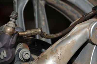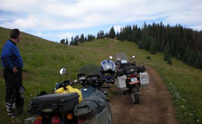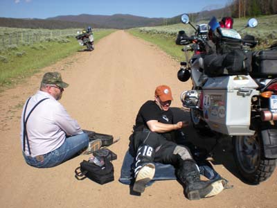 Day 14 — Tuesday August 4, 2009 On this day, disaster struck. We left Del Norte and went up Indiana Pass. About 30 miles into the ride and near the top of the pass, we ran into a "Road Closed" sign. Near the highest pass on the CDT at 11,910 ft, we had to either turn around or find another way. Our maps showed another route, RT 329 over Blow Out Pass and below Bennette's Peak (13,203 ft). We decided to take this route. After taking a wrong turn we got on another trail and before we knew it we were on top of a ridge, way above the tree line. To summit was difficult, but going uphill is always easier than going downhill. Getting to the ridge below Bennette's Peak, the trail down looked ominous. We looked around for a way out and found Trail 700. Off we went, but within yards I spun out in a lengthy muddy session. We got my bike back up and looked ahead. The trail has a steep incline and both of us recognized that following Trail 700 is not possible. We turned around and Barry lost balance trying to get a short-cut over the alpine tundra. We picked up his bike and now have to go down Blow Out Pass on a track MUCH worse than Disaster Hill. Leading us off the mountain, I stopped after a few minutes, perspiring heavily, and not because it was hot. Barry stopped next to me and said: "Jaco, there is oil leaking from your bike!" This was bad news, for it means the final drive went or my rear brake cable got loose. The terrain was so uneven and sloped that I could not get off the bike to look. It turned out the steal braided rear brake line pulled out of his housing. This is what I wrote in a book I am working on: