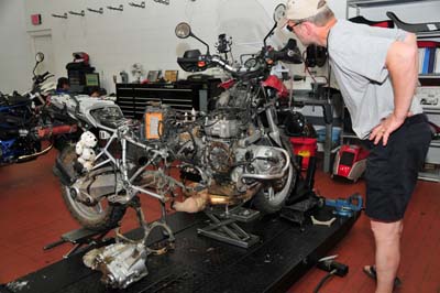 A burnt out clutch and a bike torn apart. Barry is probably wondering what I am thinking: