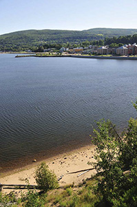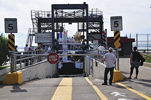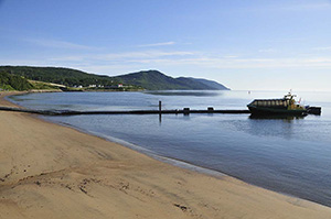 We continued onto Saint Simeon and for the first time in this Francophone region of Canada we experienced the meaning of lost in translation. Next to our hotel, that had a lovely view of the St. Lawrence and near the ferry we needed to catch to go to New Brunswick, was a restaurant. Sensing we are English we were assigned a waitress who has some English skills. The menu is all French. I ask her if they have salmon on the menu and she says yes. I order a salmon steak with salad, feeling good about my healthy choice. Barry follows my lead. We enjoy a local beer--included in the meal--and wait. And wait. When our food finally arrives it is a cheese and scallop casserole with potatoes. Having waited so long, we decide to live with the language difficulties of life and enjoyed the meal. Day 3 — Sunday July 31, 2011 We woke to another beautiful morning and headed for the ferry terminal to take us to Riviere-du-Loup, still in Quebec, but not on the south bank of the St. Lawrence. The ferry offered us a hearty breakfast as we crossed the 22km/13.5 mile stretch of water. We were joined by numerous Harley Davidson riders, some Honda Goldwing riders, and many cars as we all got onto RT20 to explore the Gaspé Peninsula. Gaspesie is the tourist area of Quebec and we could see it. Boutique farms that reminded me of Lancaster's Amish with their restaurants and markets, invited tourists in for business. The sun was bright and I was getting sunburnt despite a dark, reflective visor and factor 50 sunscreen, the side-effects of the antibiotics I was taking for the Lyme Disease. Waiting for the ferry next to St. Simeon beach. We were first in line.
