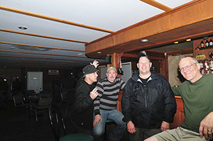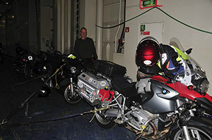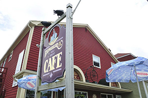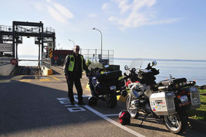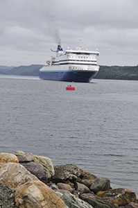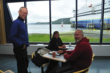 Lunch with crows watching us After a good visit to Baddeck we headed to North Sydney, only to discover few options in lodging. We continued a few miles down to road and stayed in Sydney at the Comfort Inn. We explored the board walk--not much to experience--and had a good meal after some waiting at Governors Pub and Eatery. Day 6 — Wednesday August 3, 2011 We woke to some rain and after a breakfast at the hotel, we headed to line up with many other motorcyclists, many more cars and trucks to take the 5+ hour ferry ride to Port Aux Basques, Newfoundland. While waiting for boarding to proceed, we had good conversations with the other bikers. One couple from Montreal on a Honda Goldwing trailored a popup camper that looked HUGE behind the bike. Barry and I often reflected on what it must be like to stop that setup. The Marine Atlantic Ferry was big, gulping up trucks and RVs and more with room to spare. It had wifi on board, though it was slow. The entertainment was less entertaining but we read and talked with fellow bikers as we headed to Port Aux Basques. The town forms the western end of Trans-Canada Highway 1. We would follow it to its western end at St. John's.