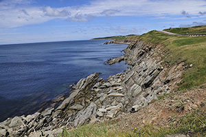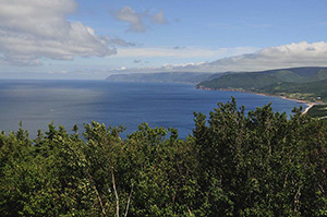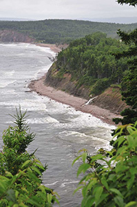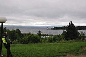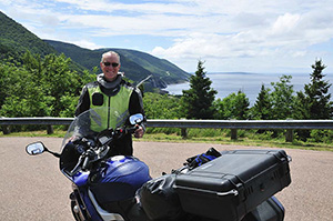 Barry with Mark and Jennie and the Atlantic Vision in the background At the terminal we met Murray from Toronto on his big KTM 990. I had my last Newfoundland cod in the cafeteria and with rain coming and going, we boarded the Atlantic Vision. Even though it was a 15 hour trip, we decided against a sleeping booth, which was expensive. Barry heard some seating on the 8th deck was the best and I went ahead to secure some seats while Barry secured his bike. We found good seats and even though sleep came and went, we had a good trip to Sydney. Day 13 — Wednesday August 10, 2011 We arrived in North Sydney around 10:30am and headed towards Cape Breton, arguably one of the best motorcycle routes in North America. This Gaelic Island of Nova Scotia is a special place. At times you are right next to the ocean only to rise high above the surf. Then you cut through green forests and pass small fishing villages. The vistas was beautiful.