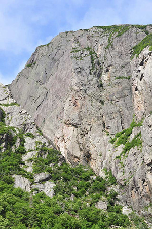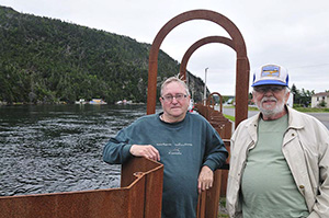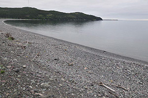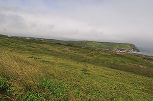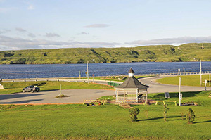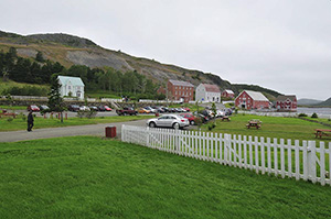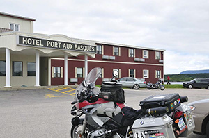 From clouds and rain to sunshine in a matter of minutes Rolling off the ferry we continued all of 1 mile before getting to our hotel for the night: Hotel Port Aux Bacques. We went to the local grocery store that had a selection of South African wines. Dinner a Subway Sandwich and Pinotage; a good combination. Travelling with our iPads, we now appreciated the wifis of hotels. We did research for the next day's ride, made reservations for camping and lodging, and Skyped the family. Making reservations in Newfoundland was important since a wedding in town or a car rally or a baseball tournament can fill up all available lodging, as we've discovered. Day 7 — Thursday August 4, 2011