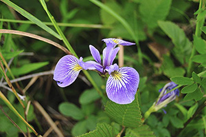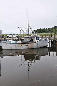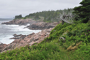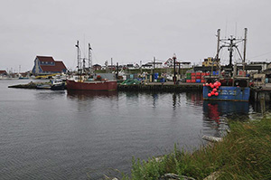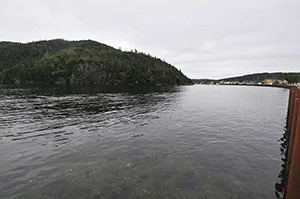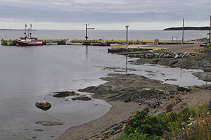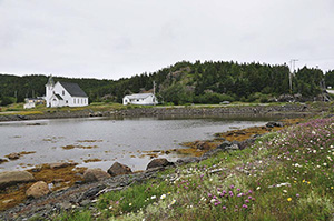Flowers on the walk back to our motorcycles After visiting the fjord, we had cod and chips at the local diner. It was a good meal. Day 8 — Friday August 5, 2011 We had a good night's rest in Rocky Harbor and returned to TCH, the Trans-Canada Highway, as Highway 1 is named, moving east. We wanted to explore some of the fishing villages off the main route and headed to Twillingate on RT 340. It was cold (low 40s in F), wet, and windy. We stopped at the visitor's center only to discover that there was no lodging available in the area. A wedding had filled all the beds. We continued onto Twillingate, enjoyed tea, coffee and something sweet at a coffee shop. It is a quaint fishing village that felt exposed to the weather of the north Atlantic, despite boasting with a protective harbor. The Twillingate Islands' communities in Notre Dame Bay know fishing well, since farming there is not really an option. We did, however, pass one saw mill that looked busy. We inquired about icebergs, since Twillingate calls itself "The Iceberg Capital of the World," but we were told that there were none close at this time. I was grateful, for venturing out into the ocean with the wind howling did not feel like a good option.