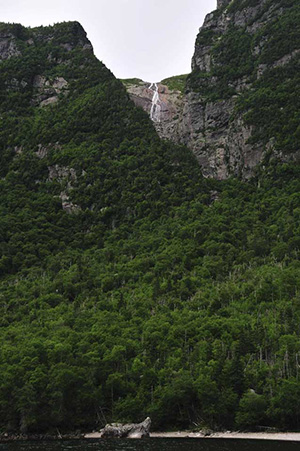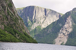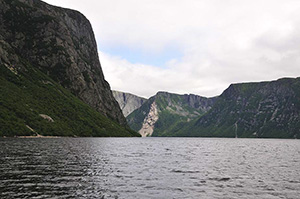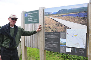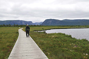 Rocky Harbor and our site for the night Gros Morne is the Northern end of the Appalachian Mountains and a rugged, beautiful park. Western Brook Pond, according to wikipedia.org, is: a fresh water fjord which was carved out by glaciers during the most recent ice age from 25,000 to about 10,000 years ago. Once the glaciers melted, the land, which had been pushed down by the weight of the ice sheet, rebounded and the outlet to the sea was cut off. The 30-kilometre (19 mi) long narrow "pond" then filled in with fresh water. The water in the fjord is extremely pure and is assigned the highest purity rating available for natural bodies of water. Pissing Mare Falls, the highest waterfall in eastern North America and 199th highest in the world, flow into Western Brook Pond. Amazing: earth that get's squashed up and then rebounds. We do live on a patient planet! Making your way to the fjord, one has to hike almost 2 miles over marshy, but flat terrain. Barry and I enjoyed the stretching of our legs and worked up a sweat in no time. The boat ride on the fjord brought a moose, wind, a few drops of rain, and sunlight. I also ran into a man from Pretoria (South Africa), visiting his brother who is an academic in Canada.