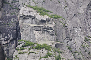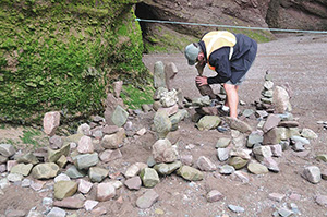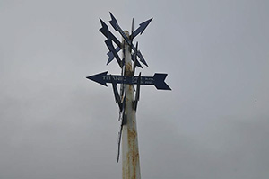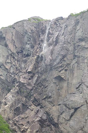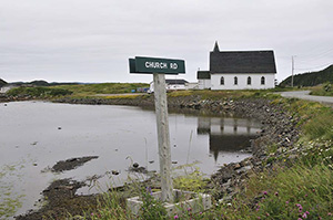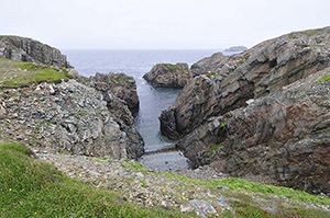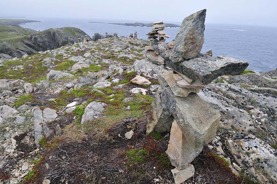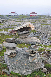 The church was for sale. Another steeple that cries. Without beds available, and with the weather removing camping as an option, we headed to Gander, the next place where we could find lodging. It was cold, windy, and wet as we rolled with RT 330 into Gander, only to discover that there is a baseball tournament in town and that lodging is limited. Gander is a bit of a hub. Also for air travellers. St. John's was experiencing fog and rain and planes were diverted to Gander. Thanks to my Garmin Zumo we found a good-enough hotel and enjoyed the hospitality of the hotel's restaurant. Day 9 — Saturday August 6, 2011 Last night we made reservations to stay over in Witless Bay (Elaine's B&B) on the east coast of Newfoundland. We woke to rain and made our way out of Gander. We continued east on TCH through Terra Nova National Park. We turned off on the RT 230 and headed to Bonavista, a quaint harbor town on the Bonavista Peninsula. It remained cold, windy, and at times wet, and my hearty breakfast late morning included chowder soup. It warmed me up well. The small working harbor looked peaceful, but I could imagine fierce looking waves beyond the breakwaters. Cod fishing placed Bonavista on the map, like many fishing villages in Newfoundland. At Cape Bonavista, a rugged outcrop, we saw whales in the distance, puffins flying about, and inukshuks people have erected. Seeing these rock sculptures, with longtime roots in Inuit culture, was one of the highlights of the trip.