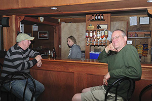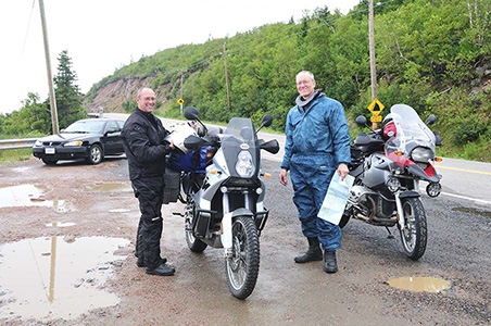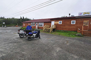 As we rejoined THC, we gassed up at a rest stop and I got rid of my rain gear as the clouds had lifted. A man walked over, asked about the direction we were heading (east), and said there is a major storm 30 minutes away. Just having gotten out of our rain gear, we headed east and indeed, 20 minutes later we had to stop to put on our rain gear again. But this time the rain came with very strong winds and periods of fog. The winds were so strong that, as the beads of water accumalated on my visor, they would be wiped clean off, as if squeegeed off. Soon we were blown all over the road, with cars going much faster than we were. It was obvious that this had become dangerous and at the Fairhaven/Bellevue crossing on the TCH, we got off the road. We thought we'd try Fairhaven first for lodging, but the road should have warned us. We embarked on a narrow, pot-holed, almost one-lane road for seven miles. With no trees or other cover, the wind was howling. Reaching the town, the rain kept coming down. We had no choice but to knock on doors asking for a Samaritan to take us in. The first house Barry knocked on was locked up. I flagged down a car and a lady, probably startled by a Michelin looking spaceman with a flip-helmet on his head, told me in no uncertain terms that there are no B&Bs in this are and that nobody would take us in, even if we would pay them. She drove off leaving us wet and we decided to head back to the TCH crossing and try Bellevue. We never made Bellevue, but at Bellevue Beach we came upon the Osprey's Nest Restaurant and Bar. I entered, asked, and we were directed to the Fiddler's Green Tourist Cabins, only to hear there is no vacancy. We were told that the cabins are occupied by long-term renters who work in a nickel factory that is being built nearby. The nickel is brought in from Labrador. Back to the bar we go. This time Barry tells our sad tale of being blown off the road, and the hostess have pity on us, calling the owner, Rod. Rod, like many, are building lodging for all the factory workers who need a bed. His rooms have been dry walled, had windows and electricity, but no running water. This place became our home for the night as we camped amidst drywall dust. Having the restaurant 20 paces away and the bar only 10, however, has its bonuses. I had cod tongue, which was great! We enjoyed the evening listening to stories about economic boom, the fishing industry almost dead, and appreciating local folks like Breen. Before we turned in--the bar kept on going--we gave Rod, who wanted nothing for his hospitality, $50 to frame as the first income he got for his new lodging venture. Being close to the bar, I can imagine he will have no shortage of renters.