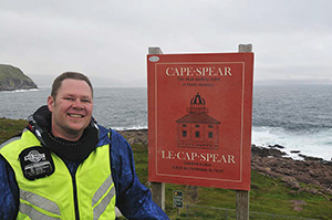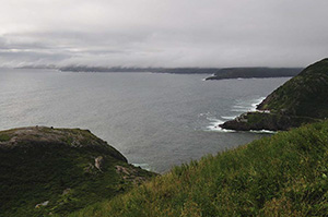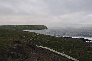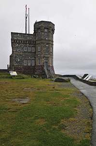 Cabot Tower and a sign that states the Titanin went down 584km / 365 miles off shore Riding to Cape Spear, we passed through downtown St. John's. I appreciated the many ethnic restaurants I saw, the harbor close by, and vowed to return. Cape Spear is on the Avalon Peninsula on the southeast point of Newfoundland. Half of Newfoundland's population lives here. Cape Spear has a rugged coastline and relics from World War II can be seen, the soldiers never seeing battle.