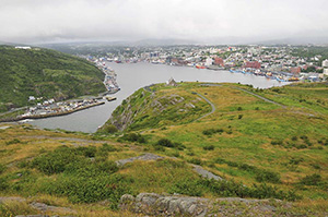 Our room for the night. Not quite a stable in Bethlehem, but we could resonate We had a good night's rest, relieved to be off the road and out of the rain and wind. Elaine's B&B at Witless Bay will see us next time. Day 10 — Sunday August 7, 2011 We woke around seven and headed to St. John's, the capital of Newfoundland. It rained most of the way and we entered the city in rain. The first hotel we visited was full and we landed a space at the Holiday Inn, glad again to be off the road. We spent the rest of the day resting and planning our ride back to Argentia, where we will get the ferry on Tuesday. With rain and wind outside we had no intension of exploring "North America's oldest city" beginning some time before 1620. The food at the restaurant, Eastside Mario's was just fine. Day 11 — Monday August 8, 2011