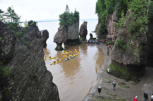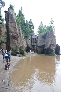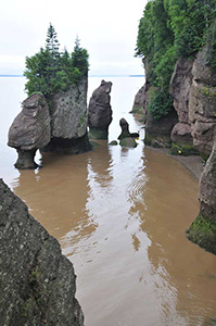 I wanted to visit Inverness to purchase some single malt Scotch at the Glenora Distillery. Sadly they came at a price-point I was not willing to pay and offered only large glass bottles. With more than 2000 miles left on our ride and little space on my motorcycle, I passed on the purchase. We had a meal in Inverness and moved on, saying goodbye to Murray after we crossed the Canso Causeway that links the island of Cape Breton and Nova Scotia. Barry and I continued on RT 104 and after we ran into some rain, slept at the Wandlyn Inn near Amherst. This is a motorcycle friendly hotel that offered rags to dry out bikes. We ate in the hotel's dining room and researched the Bay of Fundy to get there at low tide. Day 14 — Thursday August 11, 2011 We left the Wandlyn Inn just as the rain and fog burnt off in the morning sun. We needed to go towards Moncton (New Brunswick) to get to the Bay of Fundy. Our waitress last night told us about the back road through Dieppe and it worked out fine as we avoided much of the morning rush hour traffic. We turned off on Route 114, rode through small villages (Weldon, Hillsborough, and Edgetts Landing) and headed towards The Hopewell Rocks on the Bay of Fundy. We got there just as low tide was ending and could walk on the shore. I spoke with an artist who makes rock sculptures every day and then waits for the 40 foot / 12 meter tides to come in and undo his creations. The hight of the tides still boggle my mind and as one can imagine, shapes the shore constantly. The rocks, pinnacles and arches are beautiful. I appreciate the explanation of the Mikmaq first people who said that the tides were formed by a whale splashing in the water. From wikipedia.org: Oceanographers attribute it to tidal resonance resulting from a coincidence of timing: the time it takes a large wave to go from the mouth of the bay to the inner shore and back is practically the same as the time from one high tide to the next. During the 12.4 hour tidal period, 115 billion tonnes of water flow in and out of the bay. As the tied was coming in, we moved on to Alma, our last sightseeing destination before our turn home. During low tide the boats in Alma's small harbor lies on a muddy seabed (Follow the link for a few photos). We got there as the tide was coming in and did not see the full effect, but saw ladders and braces used to stabilize the boats as the water recedes. On a previous visit Barry passed through Alma as well, and he recalled the B&B where they stayed. We spoke with a few BMW riders from the Boston area who explored Nova Scotia, ate some pastries at the local bakery (I recommend lemon tarts), and turned home. From Alma we rode through the Fundy National Park on RT114 and turned west on RT1. The road was mostly a two-lane highway and we made good time until we reached Saint John, the largest city in New Brunswick.