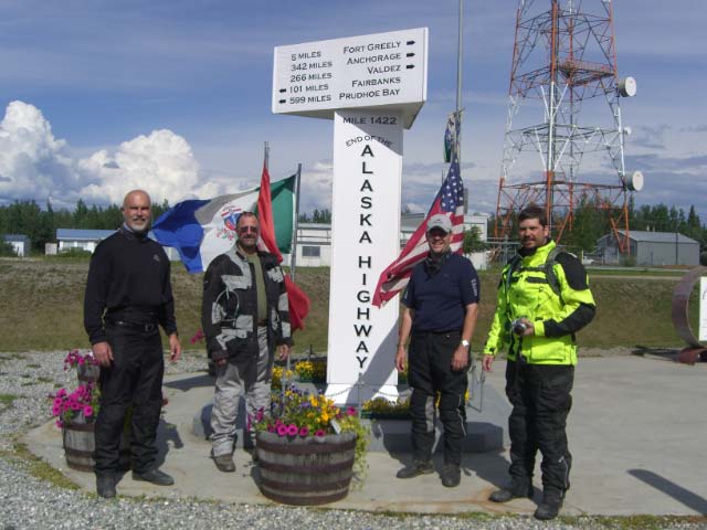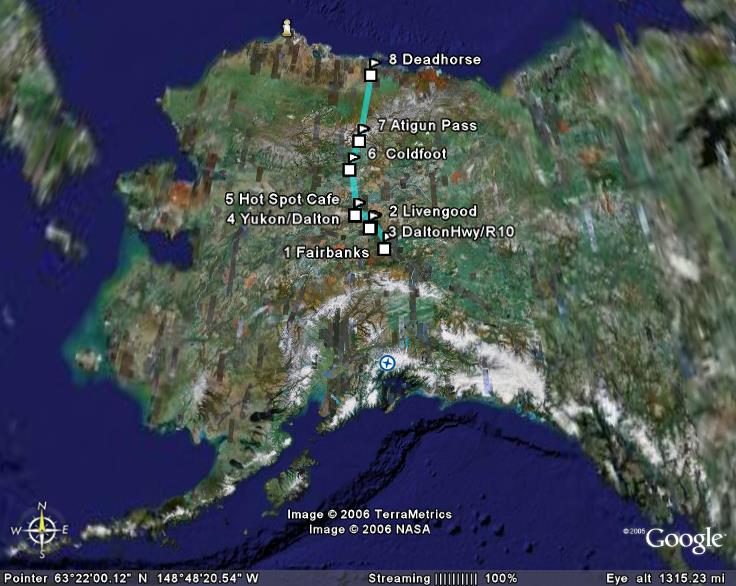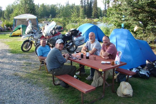 Day 10-11/July 18-19: The Dalton Highway: Fairbanks--Prudhoe Bay--Fairbanks. This is why I did the trip! My cousin Nick and I ride the famous "Haul Road." Blane joins us to the Yukon Crossing and ruins his back tire, which he had to replace on the return trip. Riding up took us 15 hours. Sometimes it was real scary as 2-3 inches of water got dumped by water trucks on calcium chloride enriched gravel roads. The locals call this slippery mix "snot". The first experience came almost immediately as we passed the Yukon River and I was thinking: "If the road is like this the whole way, there is no way I can do the remaining 300 miles!" Luckily all road maintenance has an ending and before long we were back on gravel and later chip seal with some serious pot holes. Never escaping "loose gravel," it feels as if the bikes move quite a bit beneath us. Standing up and moving slightly faster helped greatly. The weather was perfect, however, and we made good progress as we navigated the hurdles the Haul Road threw at us. There were extensive wild fires in the past years and purple fireweed form the backdrop to blackened dead trees. These plants are the first to settle burnt areas and initiates the rehabilitation process for the land. Impressive mountains such as Koyukuk Mountain greeted as we left Coldfoot. The road, of course, follows the Trans Alaska Pipeline System (TAPS), which runs 800 miles from Deadhorse on the North Slope to Valdez. It is one of the most remote roads in the US. Going over the Atigun Pass and through the Brooks Range was beautiful, but I can see the road turning into a beast when it rains. The arctic tundra was beautiful, with millions of mosquitoes welcoming us when we stopped and flowers along the road side. The musk oxen eluded us and so remained the only animal I wanted to see on this trip but did not. In my imagination I kept seeing mammoth roaming the gentle rolling landscape. We passed through a massive thunderstorm that became so dark my Zumo thought it was night, switching to night mode in an area that has near perpetual daylight this time of year. I lift my hat to the folks at Garmin, though. This GPS bounced up the Haul Road and back and still works flawlessly. Just as we passed Pump Station #2, we encountered 30 miles of gravel and stone road maintenance. A fellow biker on a Harley at Coldfoot warned us that this was the coming. He described it as "hell." The road became a river of loose stones, bigger than the "marbles" they call "gravel," and definitely more difficult to navigate. Yet the GSs did great! Still, reaching Deadhorse was a relief. Saluting Prudhoe Bay, Nick drops his bike twice within 50 yards, both at standstill and with no damage to the bike. Samaritans in big Ford F250s show up to help him out. At the Prudhoe Bay Hotel, actually a dormitory style hostel catering for oilfield workers, we heard of a Harley Davidson that came down yesterday in that 30 mile section, apparently costing the owner $2200 for a flat bed truck to haul it to Fairbanks. We also heard of a Suzuki V-Strom that ran right through a caribou, almost in sight of Deadhorse, a few days earlier... Nick describe Deadhorse as a "sci-fi city," with major security and cubicle like compounds everywhere. It was 40F on my Kisan thermometer with rain coming in sideways off the Arctic Ocean. The wind was blowing to hard I was scared it would blow our bikes off their center stands. We has a quick shower, ate well at the 24 hour cafeteria, and slept before our heads reached the pillows. The next morning, with the rain and cold continuing, and a tour to the oil fields only possible late that afternoon, we decided to start the return journey. By the time we reached the Brooks Range the rain and wind is gone and we ride in sunlight. Since we discovered that going slightly faster helps with the back tire movement and the feeling that the front end will give way, the return trip is uneventful and we make it to Fairbanks in 13 hours. Leading, I hit a few potholes in the chip seal section so hard that my handle bars, which I discovered were not fastened tight enough, would bend down. I first noticed this when Nick would disappear in my rearview mirror. I would stop and force them back into place. Covered in mud we reached our campground to tell Blane and Loren about our trip. Here we heard that Blane got a flat tire returning from the Yukon and it took him most of the day to get back. Riding up, I made Coldfoot-Prudhoe Bay (248 miles) on one tank. A mistake I made was storing the extra fuel (in a cheap Fred Meyer gas can) in my Jesse pannier. The can leaked and the gasoline started eroding the inside coating of my pannier. Back in Fairbanks, I used carpet cleaner to get rid of the smell. Camping next to us was Fred from Florida, who rode a well-farkled BMW 1150GSA. He attempted the Haul Road the next day, but we saw him again that evening when his rear brake caliper came loose. It wiped out most of his spokes... Luckily for him this happened at slow speed in a construction zone and he was not hurt. The construction folks placed his bike on a truck and took him back to Fairbanks and to George Rahn at Trail's End BMW. The Dalton Highway ("The Haul Road"):