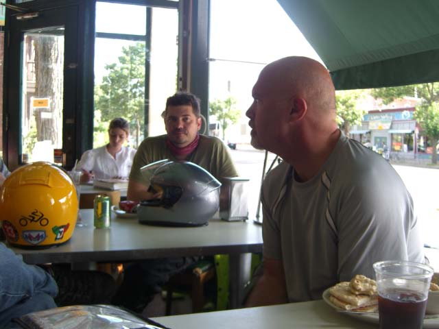 Day 2/July 10: Ludington to Fargo, SD. Our journey took us 35 miles north to Ludington where we took the SS Badger to Manitowoc (WI). The Badger assures a smooth beginning to our trip with a hearty breakfast. Traveling at a steady 17mph (according to the Zumo), we were joined by many other bikers, including a couple of guys from Belgium who flew their bikes to Boston and were heading to the BMW International Rally in West Bend, Wisconsin. I'd love to go to the Rally another year... From Manitowoc we continued along Route 29 to Bob's Java Hut in Minneapolis, a biker friendly place if there is one. At Bob's we greeted Matt and Mark who turned south to engage in official business. After spending some time on I-94, we slept in Fargo (SD). A solid 600 mile day that introduces Nick to American interstate traffic and its 18-wheelers.