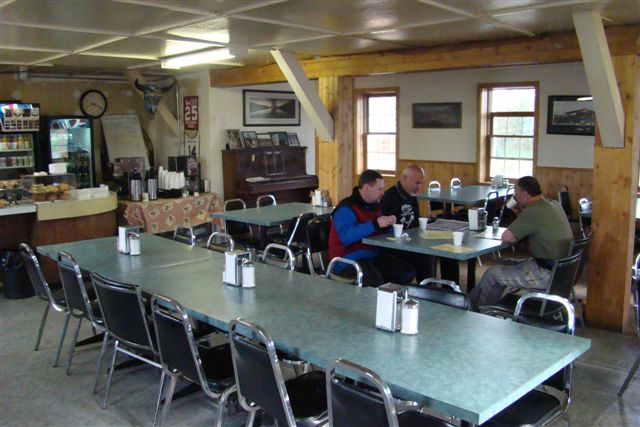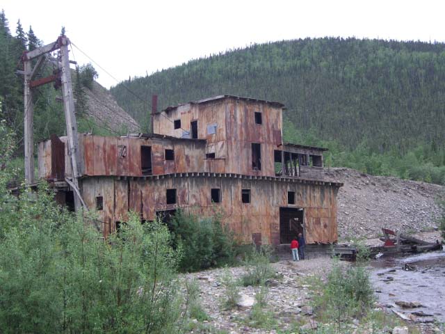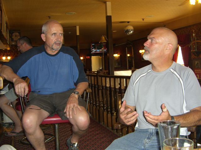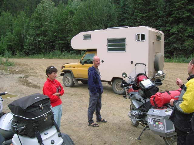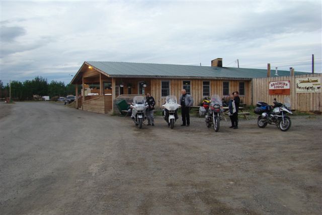 Day 8/July 16: The Klondike Loop: Whitehorse to Dawson City, with a great breakfast at Braeburn Lodge. We follow RT2 North and it seems as if we are the only ones on the road. I smell something burning...can it be Nick's bike?? It turns out we all thought there was something wrong with someone else's bike, but then we passed folks putting asphalt into potholes. We eat breakfast at the Braeburn Lodge were the cook and owner tells me that I cannot have the Braeburn omelet because it takes too much space on the griddle and my friends will have to wait a long time for their meal. We let him decide for us what we should eat. Granted, it was a great meal with THICK slices of home made bread. Before Dawson City we get our first serious "road maintenance" section which meant we all arrive coated in dust and mud. The Downtown Hotel is really biker friendly hotel and the owner and fellow GS rider, Dick Van Nostrand, came out into the street to welcome us. He showed us where we could spray off the bikes and we enjoyed local brew in the bar. We eat a great meal at Klondike Kate's restaurant. Nick and I mail back stuff we decided we will not need and the souvenirs we've bought thus far. A sometimes muddy 332 miles.