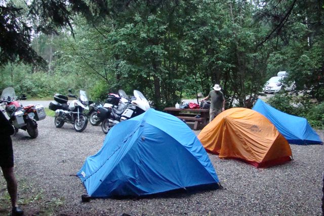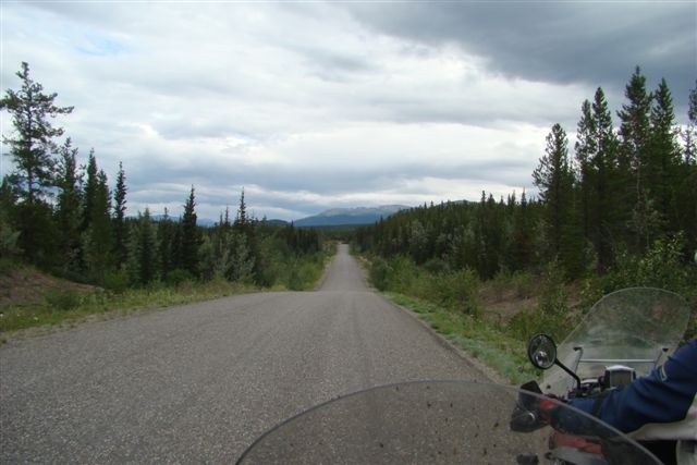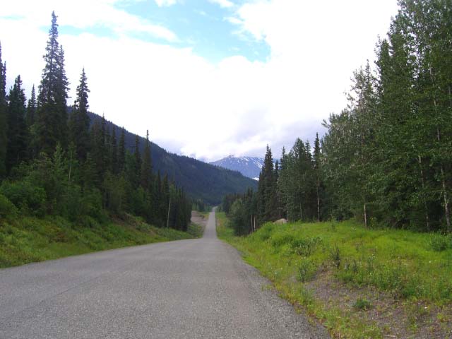 Day 18/July 26: Stewart-Cassiar Highway: Haines Junction to Dease Lake. Loren thought hard but wisely decided his RT was not built for the Cassiar. We wave him farewell at the RT37 junction and turn south. At the Junction, which was out of gas, we hear that the road was closed due to numerous washouts. The first repair section, or maybe it was just road maintenance, is half a mile from the turn-off. Besides the obligatory "snot" section, we also encountered rocks the size of tennis balls with nothing on top. Scary!!!!! Both Nick and I thought we are going to drop our bikes, but we reach the next section of chip seal giving each other a "thumbs-up." The Cassiar is seen as a minor road. No lines on the chip seal just wide enough so that two vehicles can pass each other. There are few areas cleared next to the road, allowing animals to surprise you as they walk into the road. Beyond Jade City we encounter our first grizzly. We passed him 30 yards to our right. We stopped a 100 yards down the road and watched the bear continue its path crossing the road behind us. The bear paused and gave us a curious look but before Nick or I could think of a photograph it disappears in the forest. We decide to hotel it since we enter Dease Lake as rain pours down. Today a tiring 551 miles. Day 19/July 27: Yellowhead Highway: Dease Lake to Prince George. Filling up the bikes at the gas station, we hear that there are more washouts to come. Wanting to get through the first ones before construction crews started their day, we leave Dease Lake early. The plan is to meet up with Loren in Prince George. We pass the washouts without much trouble and witness new chip seal being laid down. I am grateful that we are riding safely since my "brake failure" light is now a constant companion. Today we saw nine black bears. Amongst them were two sets of moms with two cubs each, one pair climbing a tree as we passed them a few yards away. One young bear entered the road 50 yards ahead of me as I was doing about 55mph. I decided I cannot stop, having little brakes to begin with, and stopping would probably land me very close to the bear. So I kept going, slowing somewhat if I needed to speed up to avoid a hit (a hint from the Motorcycle Safety Foundation training I regularly undergo). The bear kept walking into the road and I kept going. My adrenaline was pumping, but I was thinking: What would people say if I run into a bear? We "greeted" each other with about 3 yards to spare and Nick and I reminisced at our first stop after this encounter. The Cassiar is beautiful and well worth the trip. Less RVs than anywhere else on this whole trip and more wildlife, including a huge (and seemingly unafraid of motor vehicles) herd of mountain goat. We met up with Loren later than planned after someone in a Honda Civic nearly runs over Nick. We contemplate that event eating great Indian food. A long but eventful 603 miles.