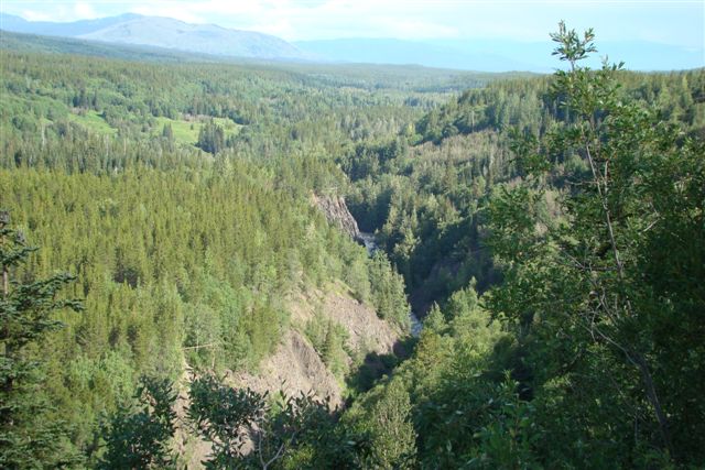 Day 6/July 14: The Alaska Highway: Dawson Creek to Liard Hot Springs. We follow RT 97, the Alaska Highway, via Fort Nelson and Muncho Lake (where we discovered we are on dry First Nations' land) to Liard Hot Springs. We see moose and caribou along the way. Warnings of bison and "loose gravel" are common. Last night we asked where the mosquitoes were and now we discovered they were all at Liard HS. Millions of them and not even DEET deterred them. They even attacked my daughters' bunny that accompanied me on the ride. The springs were free and refreshing, and quite hot. Not even the light rain could not keep the mosquitoes from mercilessly attacking us. I nearly drop my bike in our camp ground when the soft shoulder of the site gives way and my front wheel slides out. The guys rescue me as my bike rests on the Hepco-Becker engine guards and a Jesse pannier. Today we did 472 miles and we all show signs of long days in excessive heat.