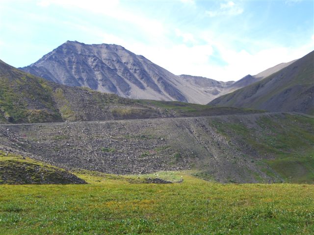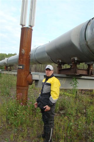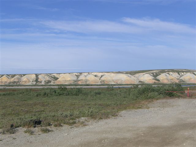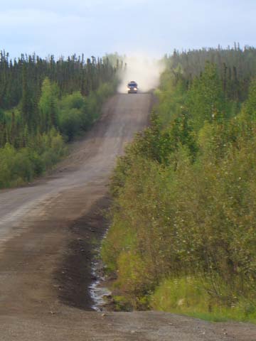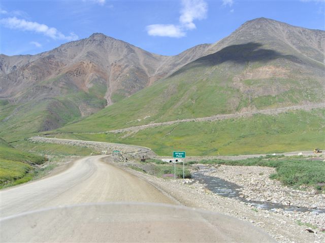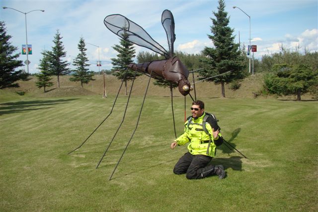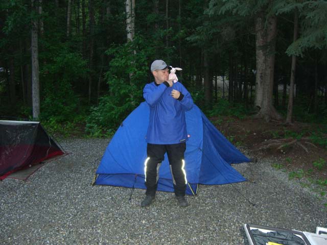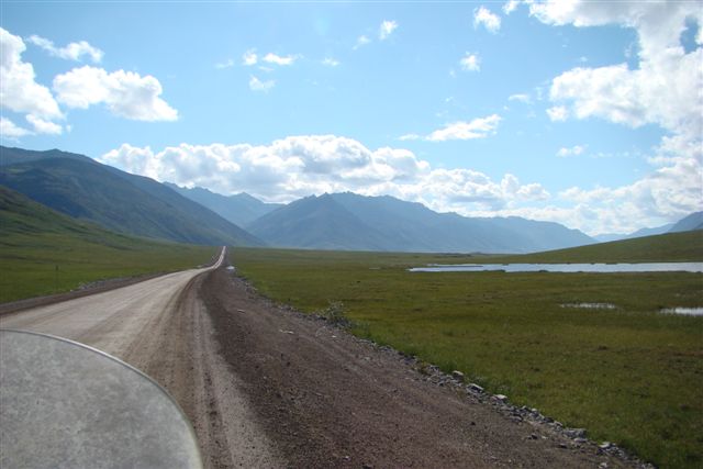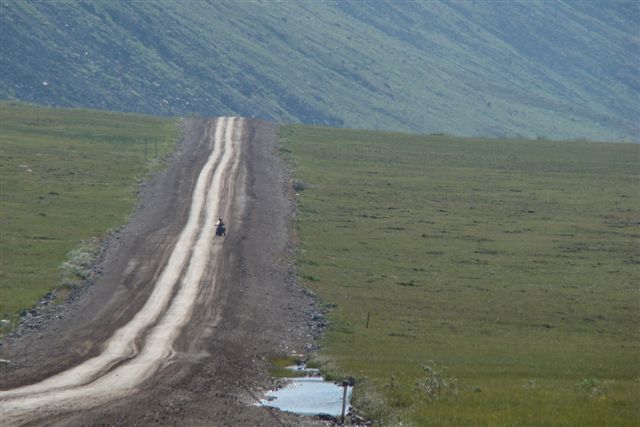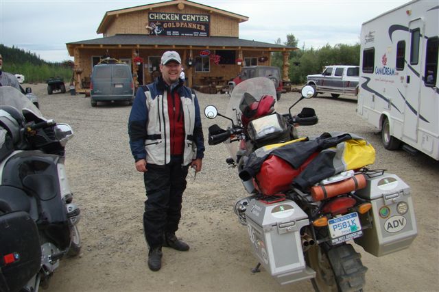 Day 9/July 17: Top of the World Highway: Dawson City to Fairbanks via Chicken and Tok. We saw signs of the Klondike gold rush and people still panning for gold. Crossing into the US at the Poker Creek Border Crossing was a breeze, even if it was a chilly one. Suddenly the heat of a few days ago felt ancient history. The Top of the World Highway is beautiful and of course, gravel. It convinced Nick, however, that he can attempt the Dalton/Haul Road. At the Jack Wade dredge we meet a couple from Switzerland that is traveling around the world, each year doing a different leg. Their Toyota Landcruiser is a great vehicle. We later passed them on the Dalton, but due to expected difficulties finding parts for their vehicle, they decided to go as far as the Brookes Range. We stop at Delta Junction, the official end of the Alaska Highway. There, the "national bird" of Alaska and Canada attacks Nick. In Fairbanks, we camp at a great campsite: River's Edge Resort, our home for the next three nights. It is close to a Fred Mayer that we frequent often the next days. Today brought 391 miles in three season weather.