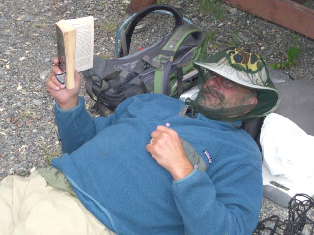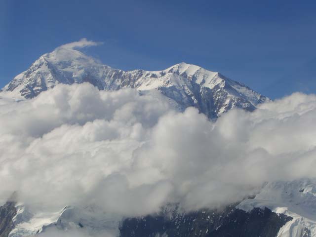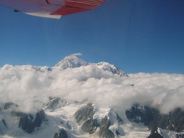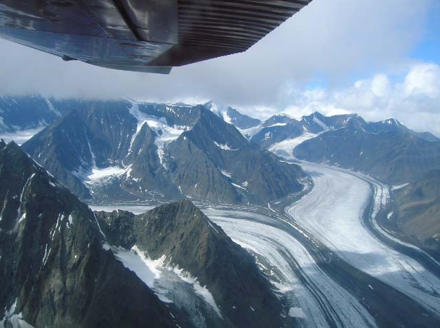 Day 13/July 21: The Parks Highway: Fairbanks to Talkeetna, via an exciting flight seeing trip over Denali. After deciding that my bike is sort of OK to continue and since George did not have the tools to help us out, we turned south to visit Denali. The good about camping is that you hear things. And so we heard about Ray Atkins, a guide that flies out of Cantwell, AK. His plane was older than any of us and our bikes were more powerful, but Ray educated us with his local knowledge as he showed us Denali and Mt. McKinley. Denali itself was awe inspiring and I was glad I saw her from a plane and not on foot, but two images remain with me. First, the hundreds (and probably thousands) of pink salmon that was running up the rivers to spawn. Even from a few hundred feet up we could clearly see them swimming to their birth ground. More impressive however, was the many glaciers who have dried up and are now "highways" of rock, gravel, and mud, with some ice . We left Denali in sunshine, but reached Talkeetna in rain. Today we did 274 miles.