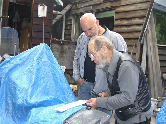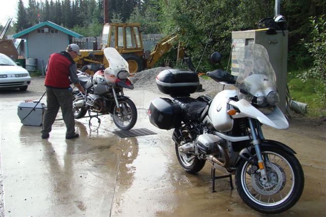 Day 12/July 20: We definitely needed a recovery day and stayed one day longer in Fairbanks than planned. This gave us a chance to visit the University of Alaska (Fairbanks), Museum. It was informative and saw a BIG grizzly. After cleaning my bike, I notice that the "Brake failure" light remained on. Blane tried to troubleshoot it and we decided it might be related to the handlebars bending down and air bubbles entering the brake lines. We headed to George Rahn to see if he could help, which he kindly agreed to do. He was gracious as we interrupted his work and he searched for a tooklBMWNA sent him. To open the brake fluid contained on a 12GS requires a special tool which George did not have. Also, I was not in the mood for a brake bleed that would take a few hours. We left his interesting shop, where old and new stand side by side, hoping that the problem would resolve itself. To make a long story short, I discovered that the battery was dying, probably the victim of the 30-something night we had in Prudhoe Bay. Somehow there was enough voltage in the battery to start the bike, but not enough to get the Servo-assist system on the GS going. I therefore had minimal brakes until the battery was adequately charged, at which point the brakes returned to life. The next days, however, I would do many miles without brakes... I finally replaced the battery in Salt Lake City.