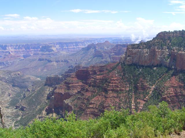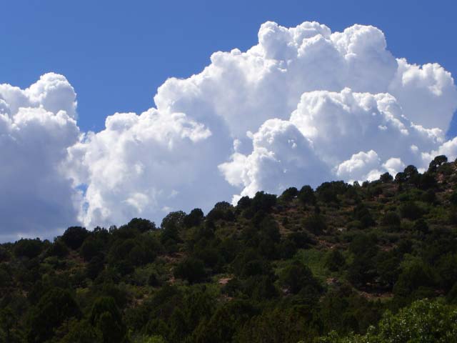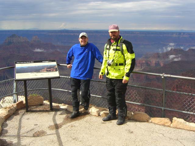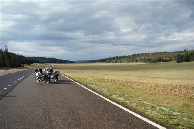 Day 24/August 1: Following RT389 and RT89 to Jacobs Lake, we turn onto RT67 and visit the North Rim of the Grand Canyon. With less people the North Rim is more fun to visit. They have a fire alarm however and our shopping is cut short. Returning to Hurricane, we see the purple horizon of a thunderstorm over Colorado City. I tell Nick I think waiting out the storm is appropriate. He motions continue. Within minutes we are in a massive electrical storm. I see a lightning bolt hit the rocky outcrop ahead of us. By now we are in a convoy of trucks and cars. The next minute a bolt hits the telephone pole to the left of us. The bolt and the bang is one. We are scared stiff but continue safely to our hotel in Hurricane. 300 scenic miles and one MASSIVE electrical storm.