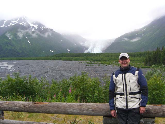 Day 14/July 22: The Sterling Highway: Talkeetna via Anchorage and on to Homer. We finally ran into the "monsoon" we have read online and in guide books that can be non-stop in late July and August. Today it rained all the way, which as most bikes would know, is not as bad as it sounds. From Talkeetna we stopped in Anchorage. Being Sunday, we missed the traffic and visited the Anchorage Museum of History and Art. It is a museum worth visiting and we learnt many interesting things, especially how the Inuit hunt whales. From there we ran south to Homer, where despite the rain we could see the beauty of the mountains across the Kachemak Bay. 334 rainy miles. Day 15:/July 23: Seward Highway: Homer to Seward. This morning we said good-bye to Blane as he started his solo ride back home. We continued on to Seward, never leaving the rain behind. Seward is located at the head of Resurrection Bay on the Kenai Peninsula. We found lodging at a great B&B: LeBarn Appetit, on the Exit Glacier Road. Having settled in, we visited the Exit Glacier and then had the best smoked salmon chowder in a sourdough bowl I've ever had (even if it was my first!). 168 wet miles following the Kenai Peninsula.