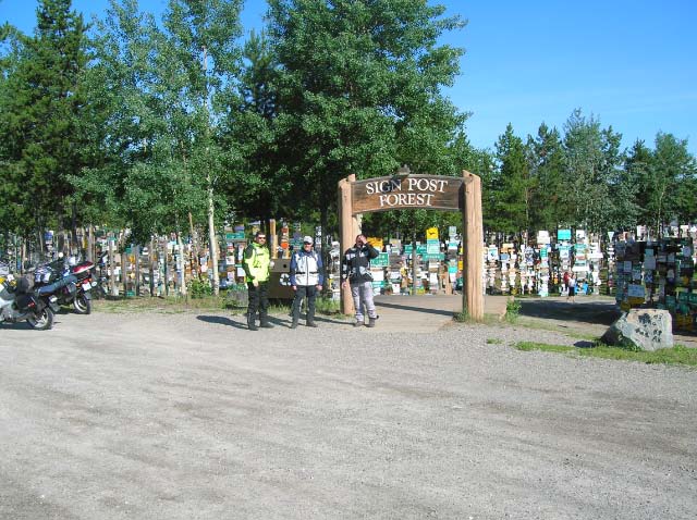 Day 7/July 15: The Alaska Highway: Liard Hot Springs to Whitehorse (YT). My wedding anniversary. Michelle is a great partner since I missed not only this anniversary, but also her birthday while on the trip. On the way we breakfast and visit the Sign Post Forest at Watson Lake. We show signs of fatigue and possibly dehydration. In Whitehorse we stay in a biker friendly hotel that smells of Germany: The River View Hotel. They provided free underground parking for the bikes and we could do our first laundry. We ate at "The Klondike Rib & Salmon BBQ" restaurant. Good food and obviously popular if one looks at the line of people waiting to be seated. Today I got a sense that the Yukon is "Larger than life," as their motto states. A muggy, sometimes rainy, and hot 402 miles.